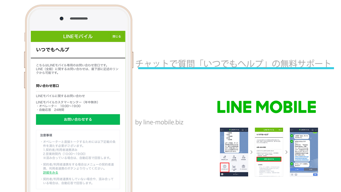 LINEモバイルに契約するとLINEからわからないことに応えてくれる「いつでもヘルプ」というサポートが無料で使えます。