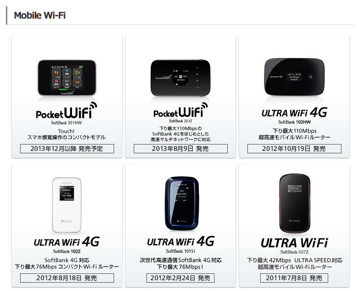 Wi-Fi NEXTmobile、Pocket WiFi 501HW、Pocket WiFi 303ZT、Pocket WiFi 304HW、Pocket WiFi 301HW、Pocket WiFi 203Z、ULTRA WiFi 4G 102HW、ULTRA WiFi 4G 102Zになります。
