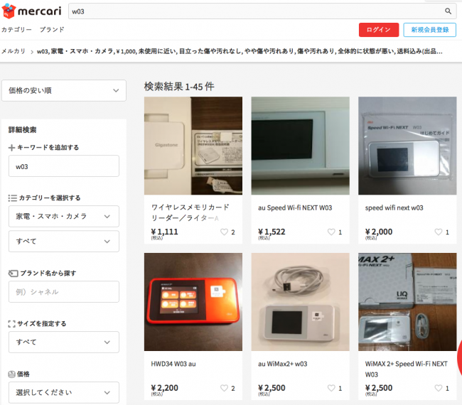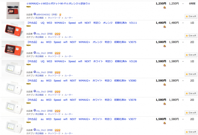 W03のポケットWiFiはヤフオクやメルカリで送料込みでも1500円〜2000円程度で購入できます。