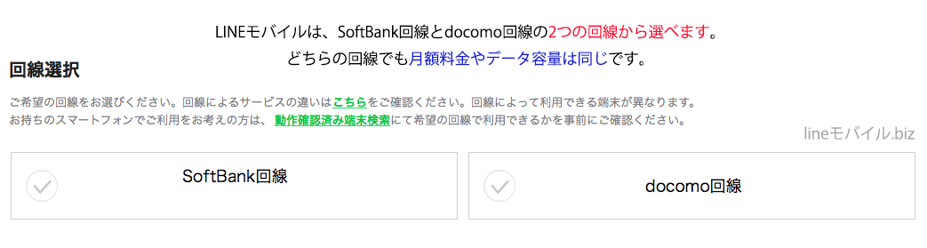 LINEモバイルはdocomo回線のSIMカードとSoftBank回線のSIMカードの2つを提供していてLINEモバイルの契約時に選択できます。