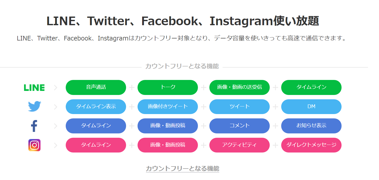 LINEやSNSのTwitter、Facebook、インスタグラムで使ったデータ量が使用したデータ量としてカウントされいないカウントフリー機能がある、