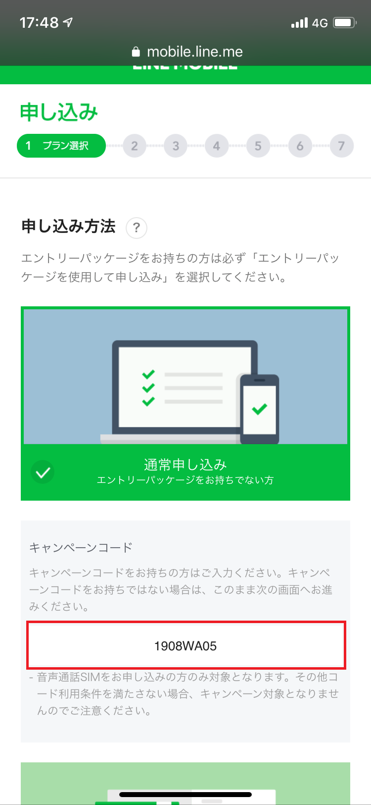 「通常申し込み」を選択して、キャンペーンコード【1908WA05】を入力してください。