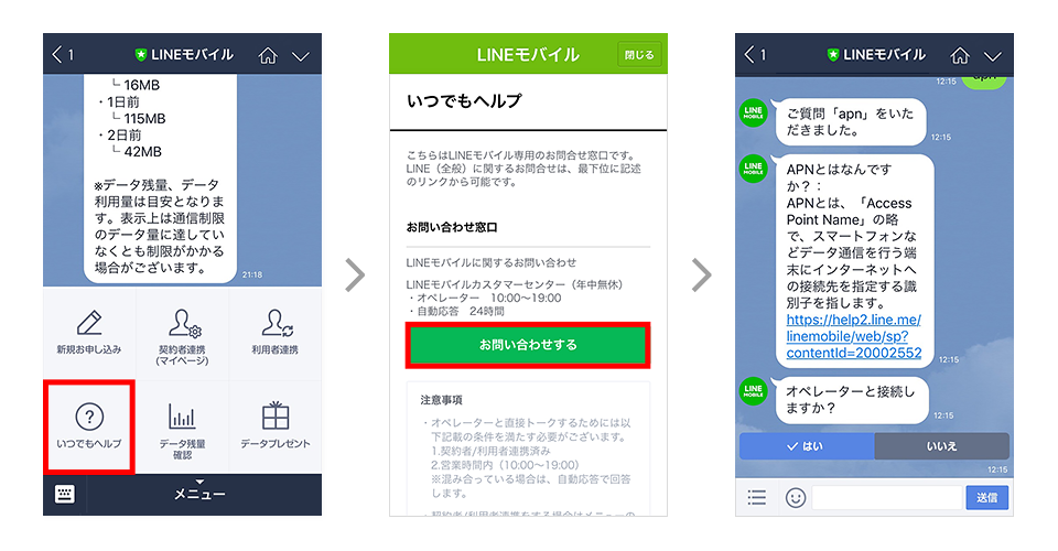LINEモバイルに契約するとLINEからわからないことに応えてくれる「いつでもヘルプ」というサポートが無料で使えます。