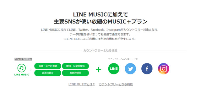 - MUSIC+プラン: LINEとSNSとLINE MUSICの通信は全てカウントフリー